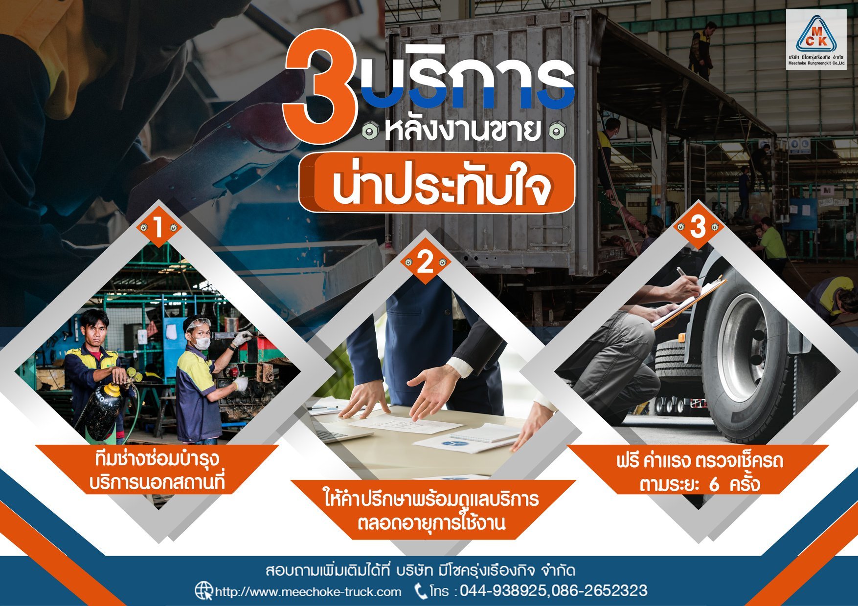 จากประสบการณ์ที่บริษัท มีโชครุ่งเรืองกิจ จำกัด ซึ่งอยู่ในเครือบริษัทมีโชคกรุ๊ป มีประสบการณ์ในการขนส่งด้วยรถบรรทุกมาเป็นเวลามากกว่า 22 ปี เราจึงสามารถรู้ถึงสมรรถนะ ปัญหาหรือข้อบกพร่องของรถบรรทุกที่ใช้งานหนัก เป็นอย่างดี ทางบริษัทฯ จึงได้จัดให้มีบริการดังนี้